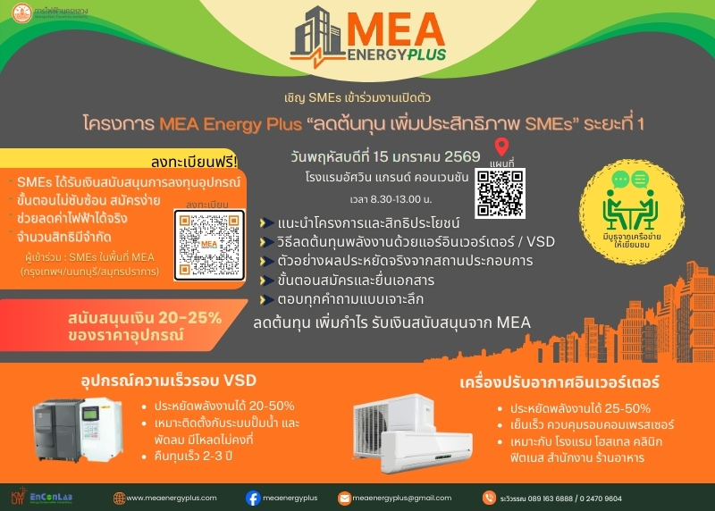 The Metropolitan Electricity Authority (MEA), in collaboration with King Mongkut’s University of Technology Thonburi (KMUTT), has launched the MEA Energy Plus Project for SMEs to support the adoption of energy-efficient equipment, helping reduce energy costs and improve business efficiency.