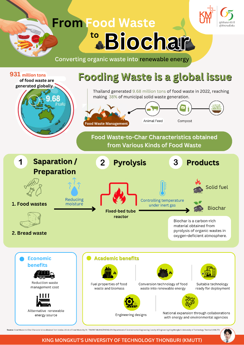 Typically, food waste management involves using it as animal feed and for composting, while the unusable parts are sent to landfill. This process incurs significant costs, primarily in transportation. “Our team thus set out to explore new ways to manage this food waste and decided on converting it into biochar, that can replace low-rank coals used for heating in various industries,” says Dr. Trairat Muangthong-on from the Department of Environmental Engineering, discussing his project titled “Food Waste-to-Char Characteristics obtained from Various Kinds of Food Waste”.