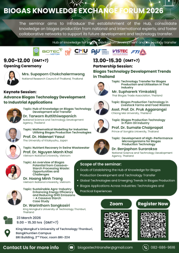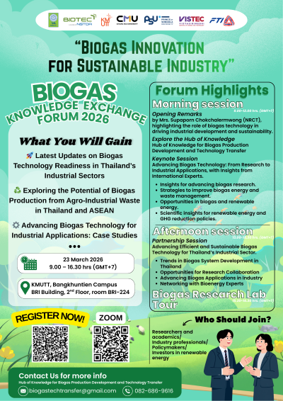 Join us for a knowledge-sharing forum highlighting the overview and development directions of biogas technologies toward industrial applications, as well as the emerging trends in biogas technology development in Thailand, presented by experts from Thailand and abroad.