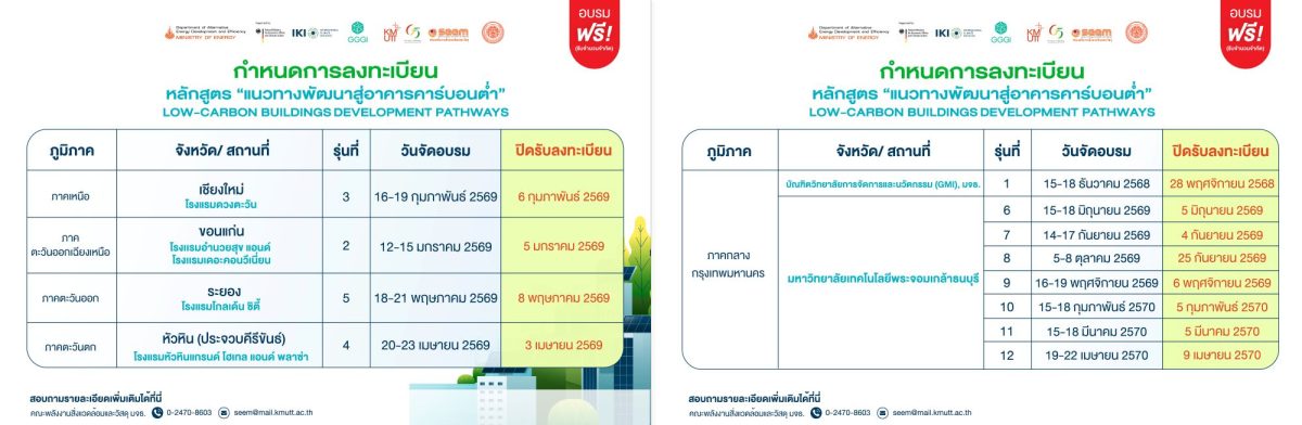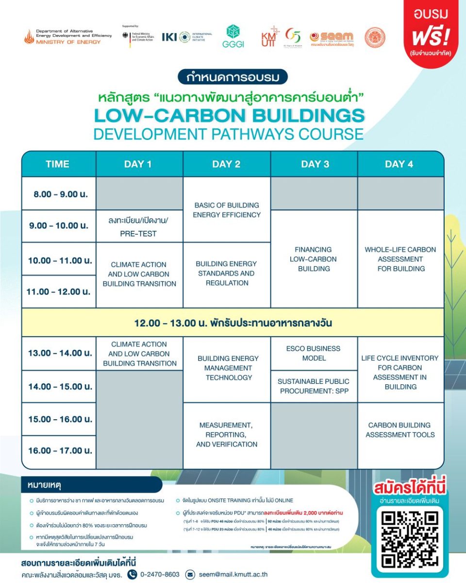 ขอเชิญเข้าร่วมอบรมในหลักสูตร “แนวทางพัฒนาสู่อาคารคาร์บอนต่ำ” (Low-Carbon Buildings Development Pathway Course)