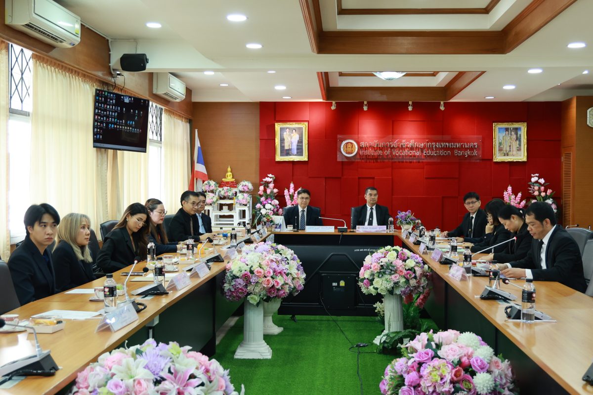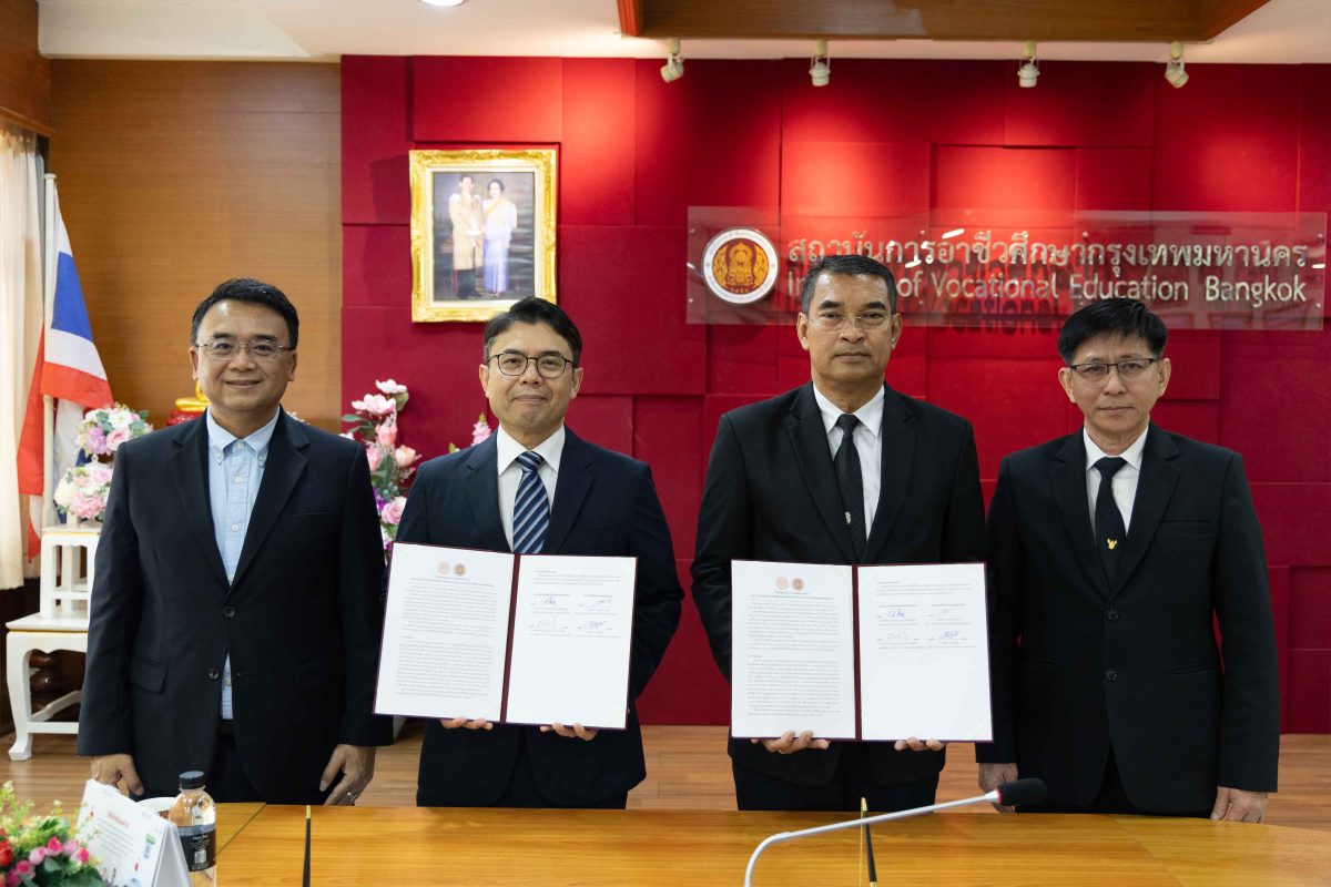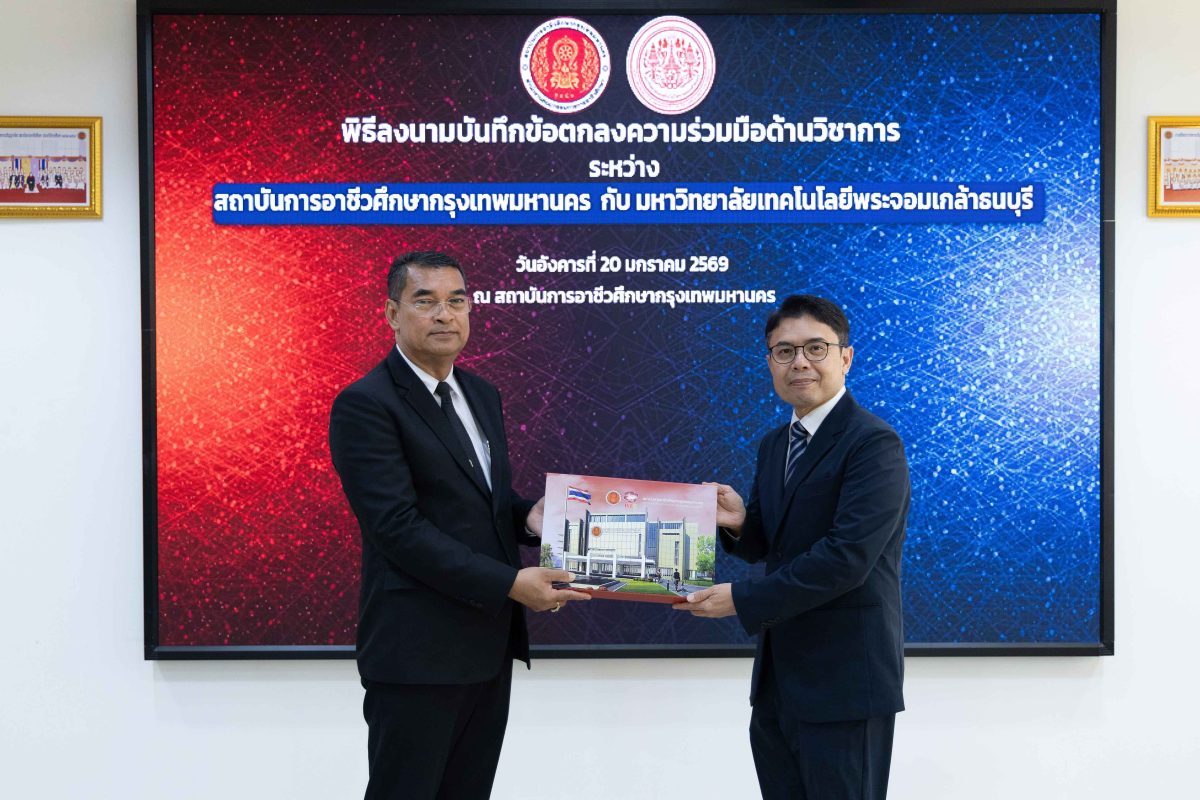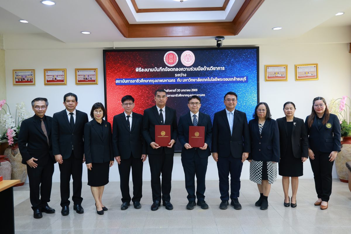 เมื่อวันที่ 20 มกราคม 2569 รศ.ดร.ธเนศ ธนิตย์ธีรพันธ์ คณบดีคณะครุศาสตร์อุตสาหกรรมและเทคโนโลยี พร้อมด้วย รศ.ดร.เสกสรรค์ แย้มพินิจ รองคณบดีฝ่ายบริการวิชาการและพัฒนาผลิตภัณฑ์ใหม่, ผศ.ดร.ธีระพงษ์ มณีเพ็ญ, ผศ.ดร.สิริมลภัคน์ สุวรรณคุณ และบุคลากรในคณะ ร่วมกับ จ่าสิบเอก ดร.สมพร ชูทอง ผู้อำนวยการสถาบันการอาชีวศึกษากรุงเทพมหานคร, นายศักดา มยูขโชต รองผู้อำนวยการสถาบันการอาชีวศึกษากรุงเทพมหานคร และผู้บริหารในสถาบันการศึกษา เข้าร่วมพิธีลงนามบันทึกข้อตกลงความร่วมมือด้านวิชาการ ระหว่าง คณะครุศาสตร์อุตสาหกรรมและเทคโนโลยี มหาวิทยาลัยเทคโนโลยีพระจอมเกล้าธนบุรี กับ สถาบันการอาชีวศึกษากรุงเทพมหานคร ณ ห้องประชุมชั้น 3 สถาบันการอาชีวศึกษากรุงเทพมหานคร โดยพิธีลงนามดังกล่าวฯ จัดขึ้นเพื่อพัฒนาบุคลากรทางการศึกษาที่สังกัด สถาบันการอาชีวศึกษากรุงเทพมหานคร ให้มีความรู้ ความสามารถในการจัดการเรียนการสอนได้อย่างมีประสิทธิภาพ และเป็นไปตามมาตรฐานการศึกษาของชาติ, เพื่อเพิ่มความสามารถบุคลากรการศึกษาที่สังกัด สถาบันการอาชีวศึกษากรุงเทพมหานคร ในการทำงานวิจัยเพื่อการพัฒนานวัตกรรมสิ่งประดิษฐ์ และการวิจัยที่ตอบสนองกับชุมชนได้อย่างเหมาะสม, เพื่อพัฒนาร่วมกันในการจัดการเรียนรู้ การฝึกปฏิบัติวิชาชีพครูของนักศึกษาระดับปริญญาตรีในหลักสูตรครุศาสตร์อุตสาหกรรมของมหาวิทยาลัยเทคโนโลยีพระจอมเกล้าธนบุรี เพื่อให้เกิดความรู้และทักษะการเรียนรู้เป็นไปตามเกณฑ์ของคุรุสภาที่ได้กำหนดไว้ และเพื่อส่งเสริมภารกิจอื่นที่ตอบสนองการเสริมสร้างความก้าวหน้าทางด้านการศึกษาและด้านวิชำการของอาชีวศึกษา