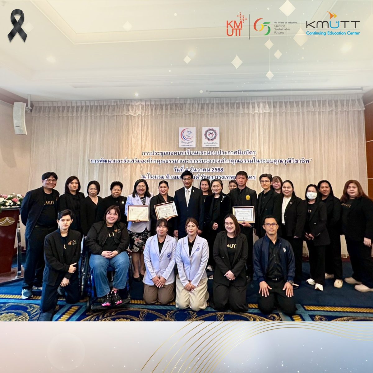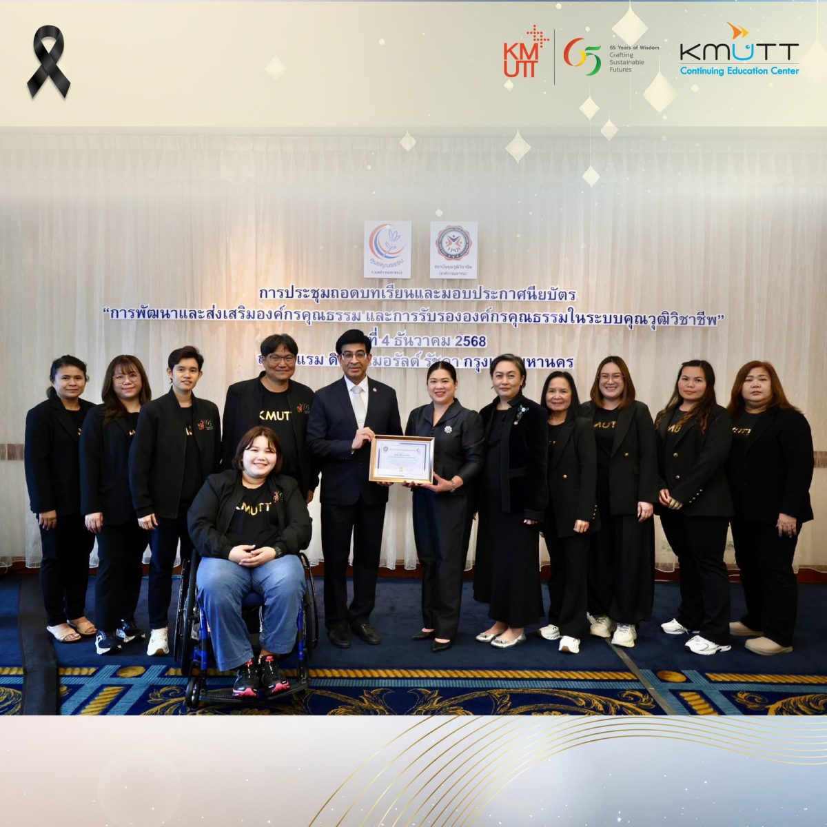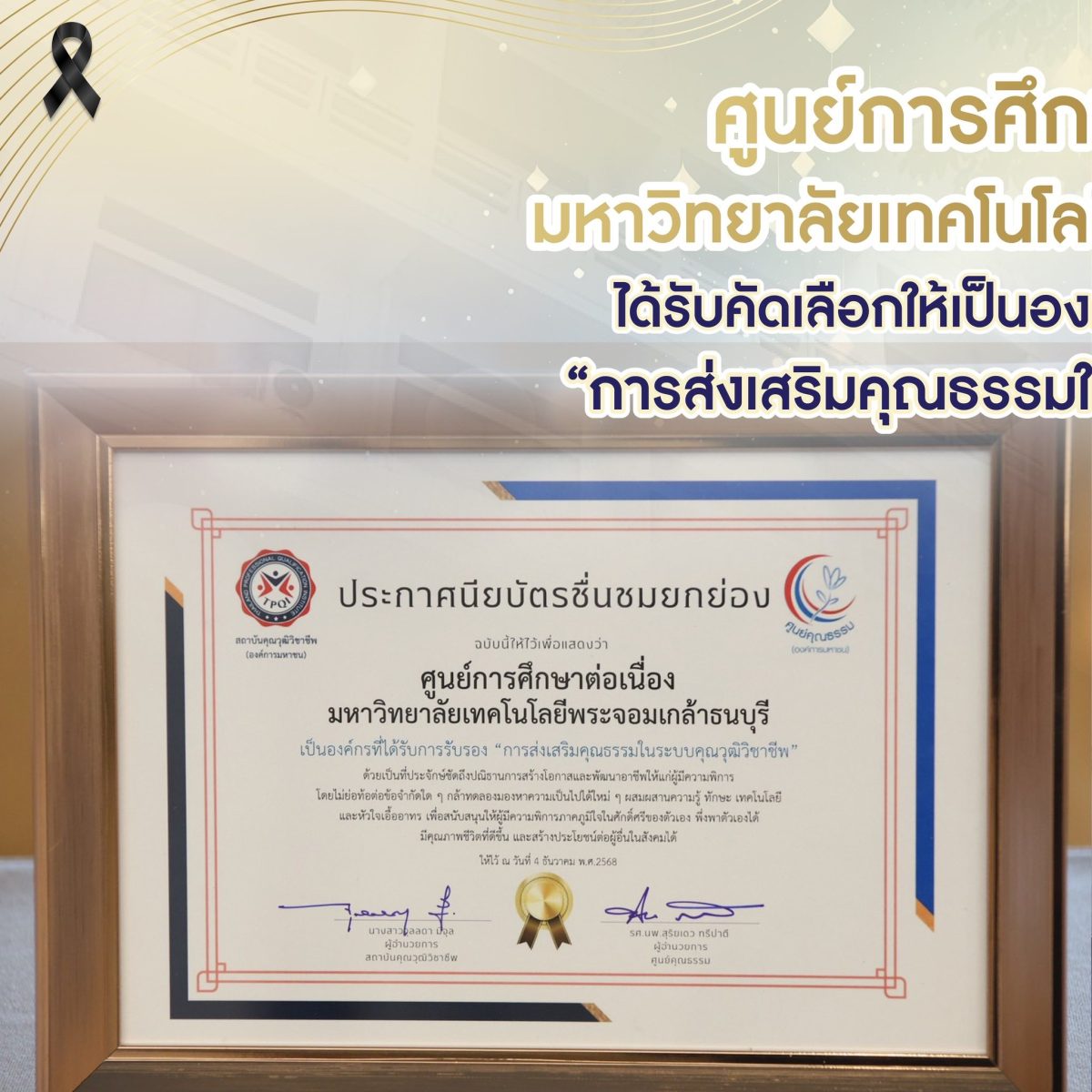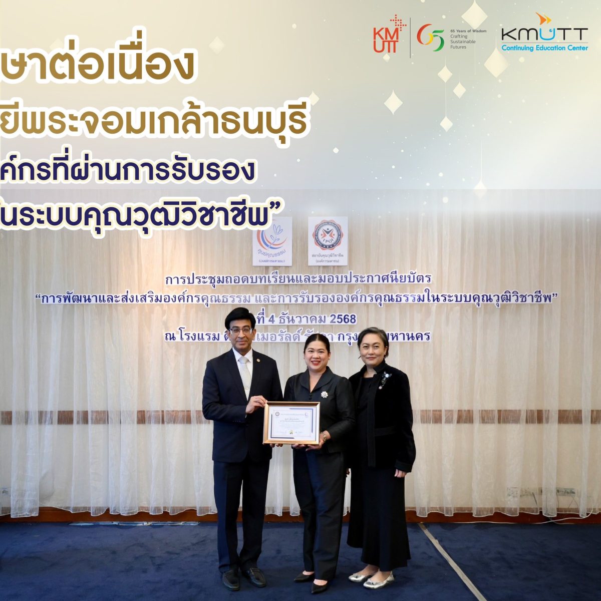 ศูนย์การศึกษาต่อเนื่อง มหาวิทยาลัยเทคโนโลยีพระจอมเกล้าธนบุรี ได้รับคัดเลือกให้เป็นองค์กรที่ผ่านการรับรอง “การส่งเสริมคุณธรรมในระบบคุณวุฒิวิชาชีพ”