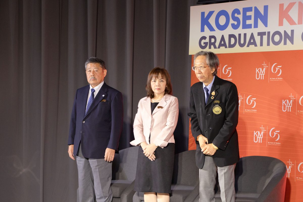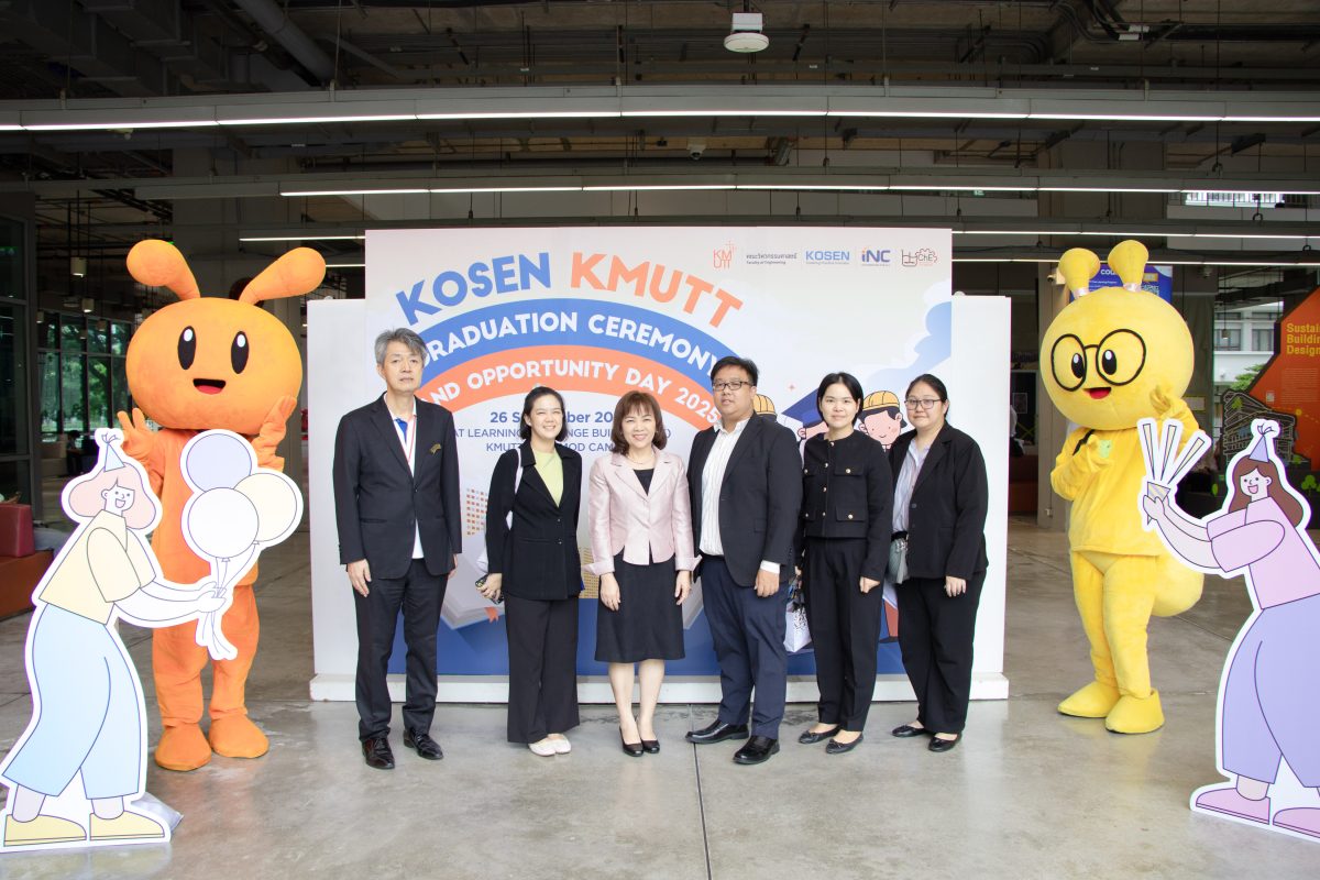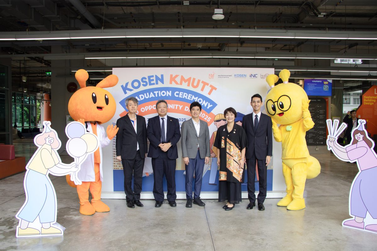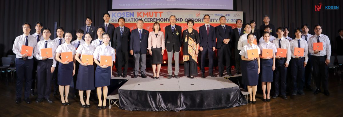 เมื่อวันที่ 26 กันยายน 2568 มหาวิทยาลัยเทคโนโลยีพระจอมเกล้าธนบุรี (มจธ.) จัดงาน “KOSEN KMUTT Graduation Ceremony and Opportunity Day 2025” ณ อาคารการเรียนรู้พหุวิทยาการ มจธ. บางมด โดยได้รับเกียรติจาก รศ. ดร.สุวิทย์ แซ่เตีย อธิการบดีมหาวิทยาลัยเทคโนโลยีพระจอมเกล้าธนบุรี เป็นประธานมอบอนุปริญญาบัตรแก่ผู้สำเร็จการศึกษาในปีการศึกษา 2568 พร้อมด้วย Ms. Maki KAWAMURA ผู้แทนจาก The Embassy of Japan, Thailand, Mr. Shunsuke SAKUDO ผู้แทนจาก Japan International Cooperation Agency (JICA), Mr. Nobuyuki ISHII ผู้แทนจาก Japanese Chamber of Commerce, Bangkok (JCC), Dr. Hideharu NAKASHIMA ผู้แทนจาก National Institute of Technology (NIT) และ คุณวัฒนาโสภี สุขสอาด ผู้อำนวยการโครงการไทยโคเซ็น จากสำนักงานปลัดกระทรวงการอุดมศึกษา วิทยาศาสตร์ วิจัยและนวัตกรรม ร่วมเป็นเกียรติในพิธี โดยภายในงานยังมี รศ. ดร.ทวิช พูลเงิน คณบดีคณะวิศวกรรมศาสตร์ คณะผู้บริหาร คณาจารย์ ตลอดจนผู้ปกครองร่วมแสดงความยินดีกับผู้สำเร็จการศึกษาอย่างอบอุ่นและประทับใจ บรรยากาศเต็มไปด้วยรอยยิ้มและความภาคภูมิใจในความสำเร็จของนักศึกษา