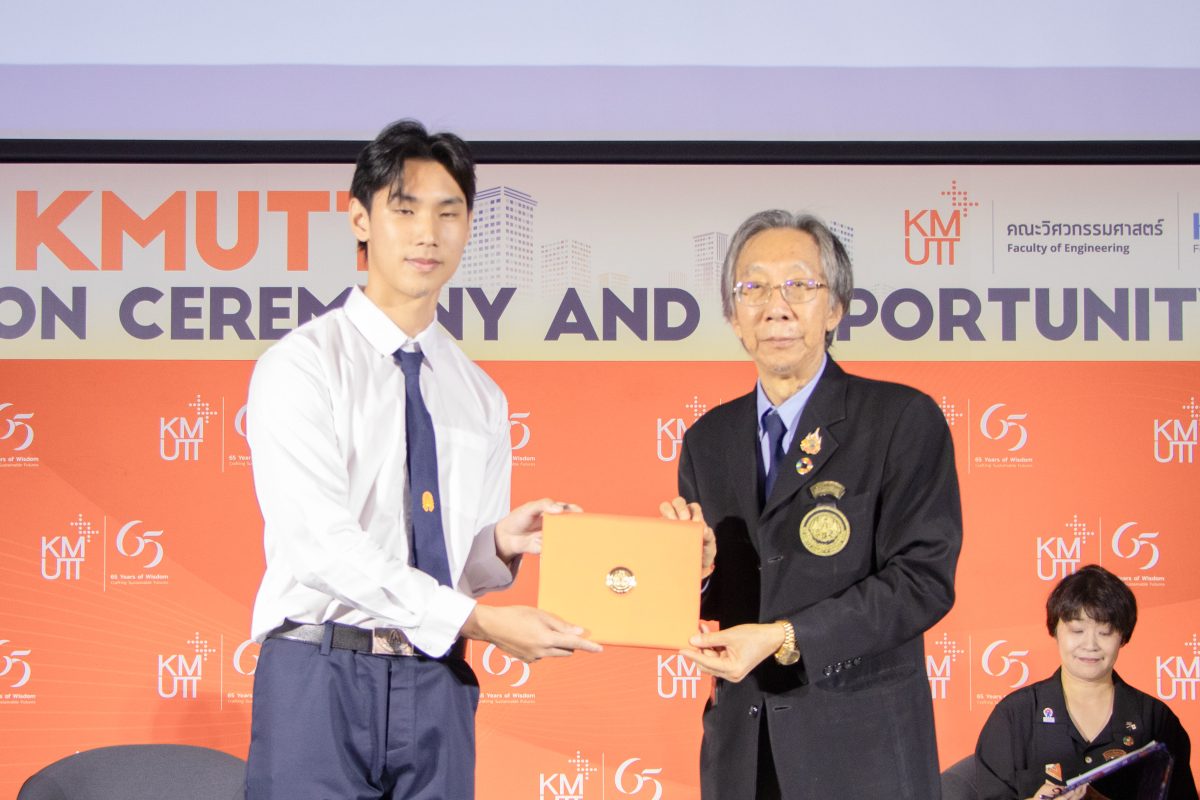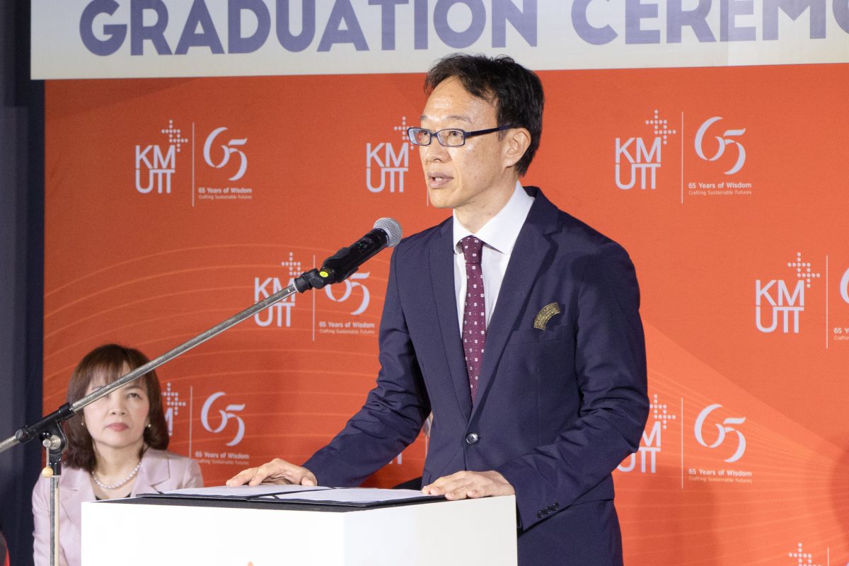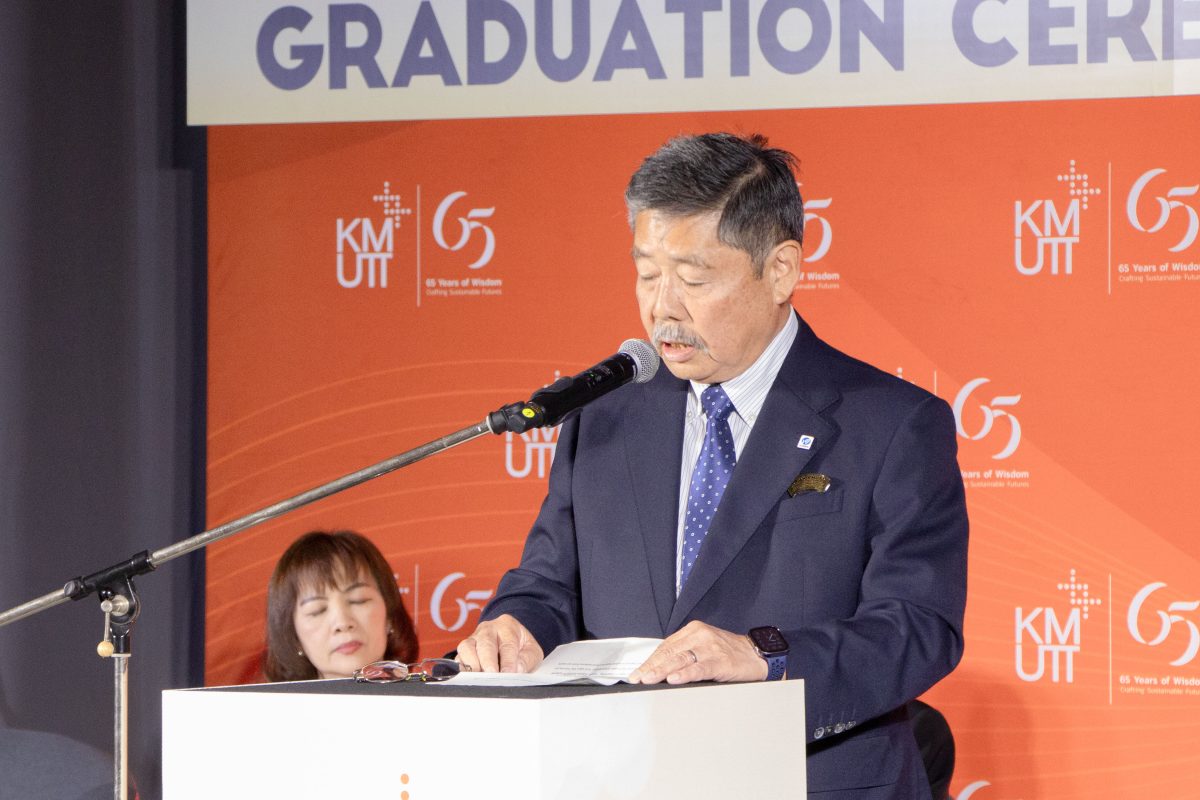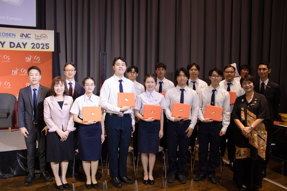 เมื่อวันที่ 26 กันยายน 2568 มหาวิทยาลัยเทคโนโลยีพระจอมเกล้าธนบุรี (มจธ.) จัดงาน “KOSEN KMUTT Graduation Ceremony and Opportunity Day 2025” ณ อาคารการเรียนรู้พหุวิทยาการ มจธ. บางมด โดยได้รับเกียรติจาก รศ. ดร.สุวิทย์ แซ่เตีย อธิการบดีมหาวิทยาลัยเทคโนโลยีพระจอมเกล้าธนบุรี เป็นประธานมอบอนุปริญญาบัตรแก่ผู้สำเร็จการศึกษาในปีการศึกษา 2568 พร้อมด้วย Ms. Maki KAWAMURA ผู้แทนจาก The Embassy of Japan, Thailand, Mr. Shunsuke SAKUDO ผู้แทนจาก Japan International Cooperation Agency (JICA), Mr. Nobuyuki ISHII ผู้แทนจาก Japanese Chamber of Commerce, Bangkok (JCC), Dr. Hideharu NAKASHIMA ผู้แทนจาก National Institute of Technology (NIT) และ คุณวัฒนาโสภี สุขสอาด ผู้อำนวยการโครงการไทยโคเซ็น จากสำนักงานปลัดกระทรวงการอุดมศึกษา วิทยาศาสตร์ วิจัยและนวัตกรรม ร่วมเป็นเกียรติในพิธี โดยภายในงานยังมี รศ. ดร.ทวิช พูลเงิน คณบดีคณะวิศวกรรมศาสตร์ คณะผู้บริหาร คณาจารย์ ตลอดจนผู้ปกครองร่วมแสดงความยินดีกับผู้สำเร็จการศึกษาอย่างอบอุ่นและประทับใจ บรรยากาศเต็มไปด้วยรอยยิ้มและความภาคภูมิใจในความสำเร็จของนักศึกษา