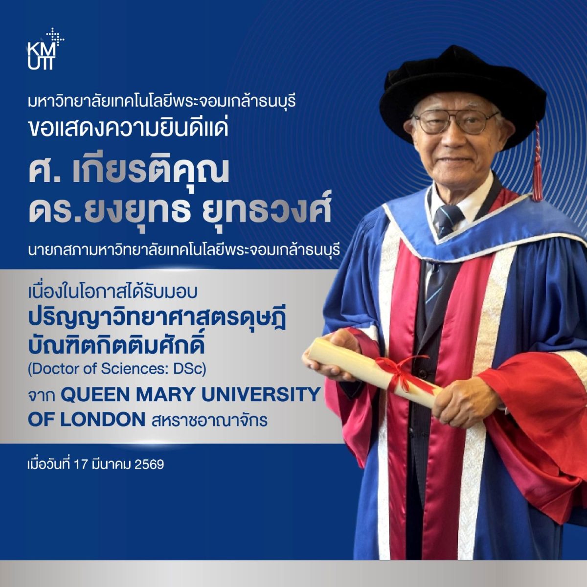 ศ.เกียรติคุณ ดร.ยงยุทธ ยุทธวงศ์ นายกสภามหาวิทยาลัยเทคโนโลยีพระจอมเกล้าธนบุรี ได้รับมอบปริญญาวิทยาศาสตรดุษฎีบัณฑิตกิตติมศักดิ์ เพื่อเป็นการเชิดชูเกียรติในความทุ่มเพื่อการพัฒนาความก้าวหน้าทางวิทยาศาสตร์เพื่อประโยชน์ของสังคม ตลอดจนความสัมพันธ์อันแน่นแฟ้นที่มีต่อ ควีนแมรี่ มหาวิทยาลัยลอนดอน (Queen Mary University of London: QMUL) โดยมี Professor Colin Bailey CBE, FREng, President and Principal, Professor Wen Wang FREng, Vice Principal for Science and Engineering, และผู้บริหารจาก School of Engineering and Materials Science (SEMS), Queen Mary University of London ได้ให้การต้อนรับ