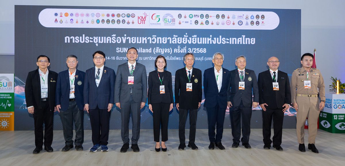 วันที่ 15 ธันวาคม 2568 พิธีเปิดการประชุมเครือข่ายมหาวิทยาลัยยั่งยืนแห่งประเทศไทย (SUN Thailand) สัญจร ครั้งที่ 3 ประจำปี 2568 โดยมีรองศาสตราจารย์ ดร.สุวิทย์ แซ่เตีย อธิการบดี มจธ. กล่าวต้อนรับ รศ. ดร.ณัฐพงศ์ มกระธัช ประธานเครือข่าย SUN Thailand ประจำปี 2568 กล่าวรายงาน และ นางสาวฐิติลักษณ์ คำพา ผู้ว่าราชการจังหวัดราชบุรี เป็นประธานกล่าวเปิดงาน พร้อมด้วย ผศ. ดร.ประเสริฐ คันธมานนท์ รองอธิการบดีอาวุโสฝ่ายบริหาร มจธ. และประธานคณะกรรมการดำเนินงานการจัดเตรียมการประชุมเครือข่ายมหาวิทยาลัยจัดงานการประชุมเครือข่ายมหาวิทยาลัยยั่งยืนแห่งประเทศไทย (สัญจร) ครั้งที่ 3 ประจำปี 2568 (SUN Thailand) ร่วมให้การต้อนรับ