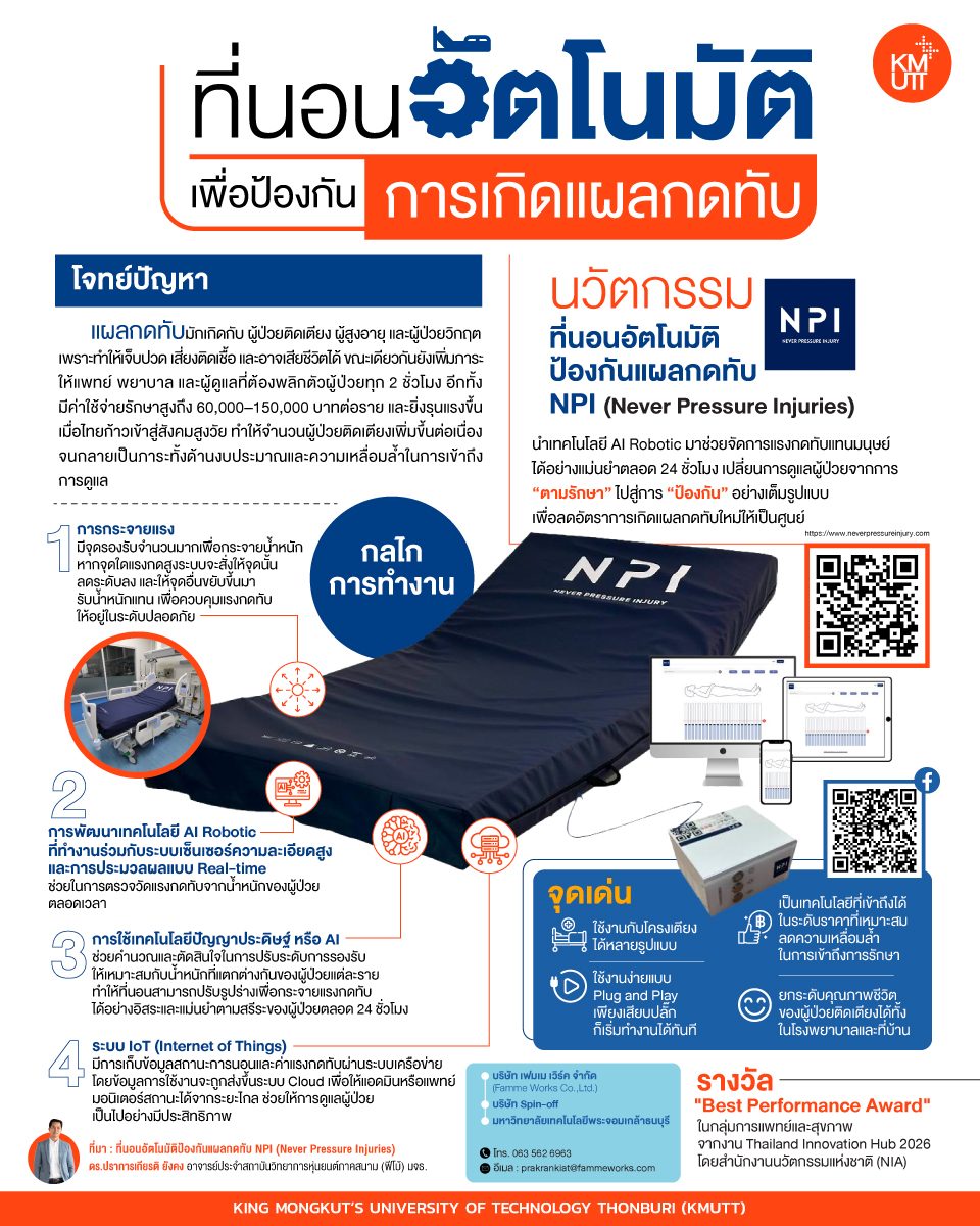 จึงเป็นที่มาของ “ที่นอนอัตโนมัติป้องกันแผลกดทับ NPI (Never Pressure Injuries)” ที่พัฒนาขึ้นโดยทีมวิจัยจากสถาบันวิทยาการหุ่นยนต์ภาคสนาม (FIBO) มหาวิทยาลัยเทคโนโลยีพระจอมเกล้าธนบุรี (มจธ.) ร่วมกับบริษัท เฟมเม เวิร์ค จำกัด (Famme Works Co.,Ltd.) บริษัท Spin-off ของ มจธ. มีเป้าหมายสำคัญคือการนำเทคโนโลยี AI Robotic มาช่วยทำหน้าที่แทนมนุษย์ในการจัดการแรงกดทับอย่างแม่นยำตลอด 24 ชั่วโมง เพื่อเปลี่ยนนิยามการดูแลผู้ป่วยจากการ ‘ตามรักษา’ เป็นการ ‘ป้องกันอย่างสมบูรณ์แบบ’ จนทำให้อัตราการเกิดแผลกดทับใหม่กลายเป็นศูนย์ (Zero Pressure Injuries) ได้ในที่สุด