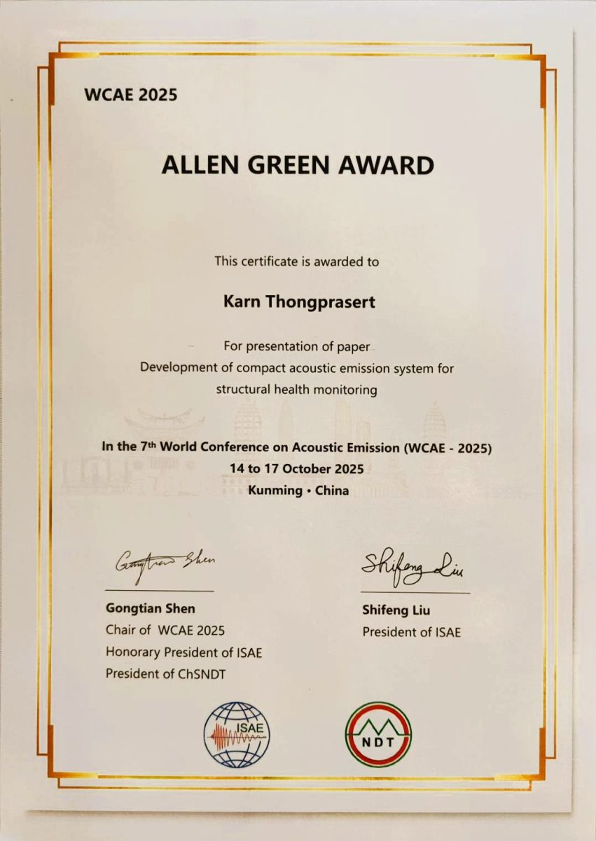 สำหรับรางวัล Allen Green Award นั้น ได้นำชื่อมาจาก Mr. Allen T. Green ซึ่งเป็นปูชนียบุคคลด้านอะคูลติกอีมิชชั่นชาวอเมริกันที่ได้พัฒนาวิธีการและเครื่องมือตรวจสอบวิธีอะคูสติกอีมิชชั่น และร่วมก่อตั้ง Acoustic Emission Working Group ในปี ค.ศ. 1967 โดยรางวัล Allen Green Award นี้เป็นรางวัลพิเศษสำหรับ นิสิต/นักศึกษาที่ส่งบทความฉบับเต็มและนำเสนอผลงานภายในงาน WCAE-2025 ซึ่งได้รับการคัดเลือกเป็นผลงานดีเด่นโดยคณะกรรมการผู้เชี่ยวชาญ