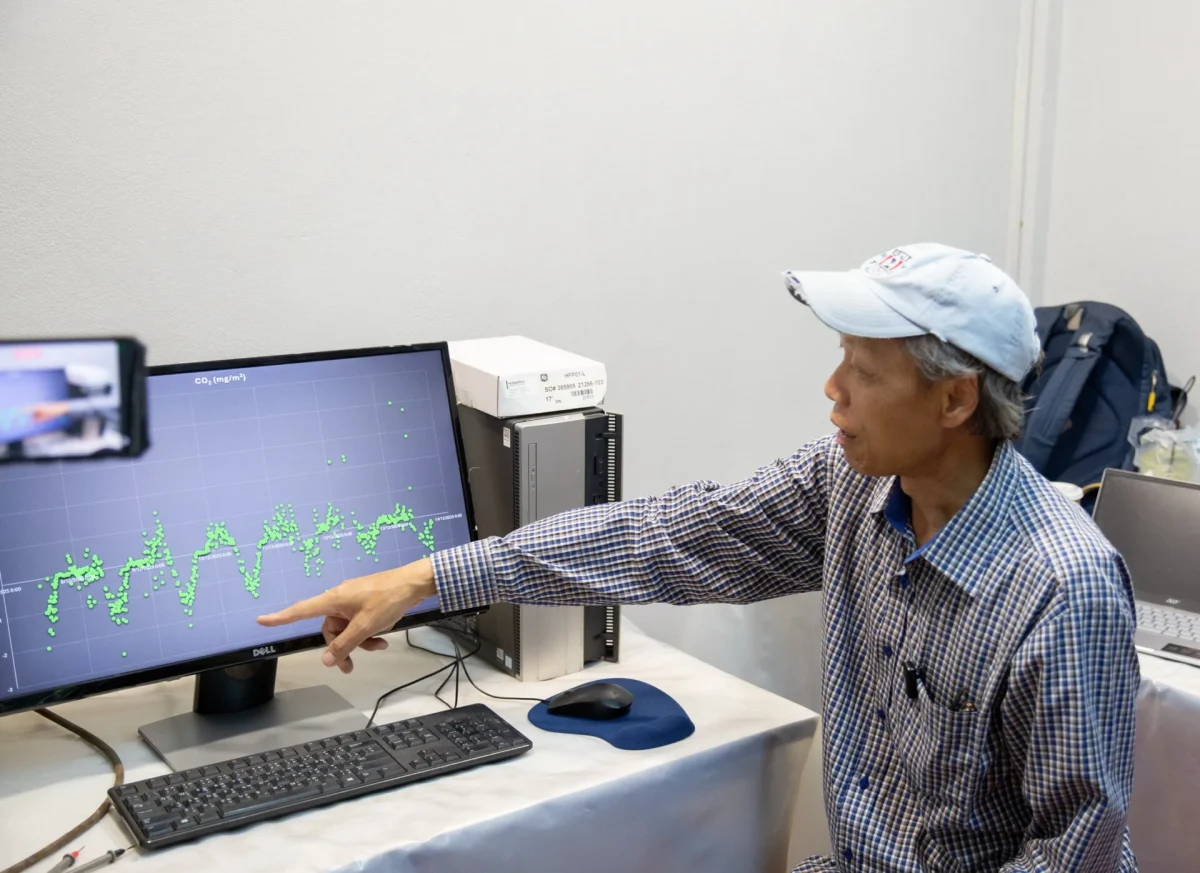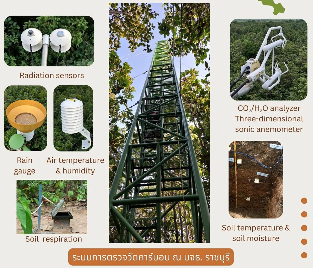 รศ.ดร.อำนาจ ชิดไธสง อาจารย์ประจำบัณฑิตวิทยาลัยร่วมด้านพลังงานและสิ่งแวดล้อม (JGSEE) เปิดเผยว่า สถานีแห่งนี้พัฒนามาจาก “หอคอยตรวจวัดคาร์บอน” ซึ่งใช้เทคโนโลยีขั้นสูงอย่าง Eddy Covariance โดยหอคอยสูง 20 เมตรกลางผืนป่าแห่งนี้บันทึกข้อมูลสำคัญทั้งคาร์บอน น้ำ อุณหภูมิ และความชื้น เพื่อใช้ติดตามการปล่อยและการกักเก็บคาร์บอนของป่าเต็งรังในพื้นที่ มจธ.ราชบุรี