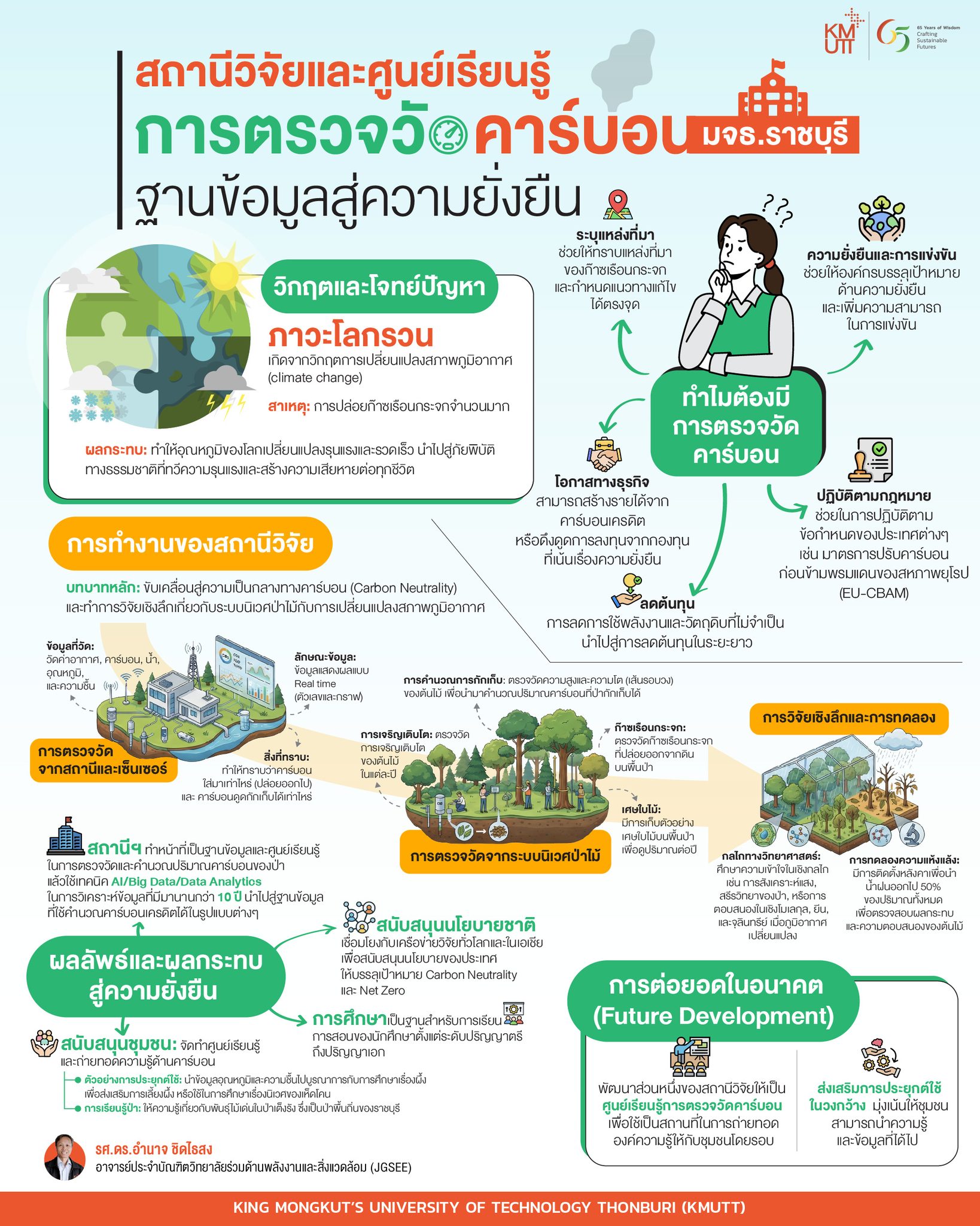 มหาวิทยาลัยเทคโนโลยีพระจอมเกล้าธนบุรี (มจธ.) ราชบุรี เดินหน้าพัฒนาสถานีวิจัยและศูนย์เรียนรู้การตรวจวัดคาร์บอน พร้อมเปิดพื้นที่เป็นแหล่งเรียนรู้สำหรับนักศึกษา หน่วยงานรัฐ และชุมชนในจังหวัดราชบุรี นำข้อมูลวิจัยระยะยาวกว่า 10 ปีสู่การใช้ประโยชน์จริง เพื่อสนับสนุนเป้าหมายประเทศด้าน Carbon Neutrality และ Net Zero อย่างมีคุณภาพ