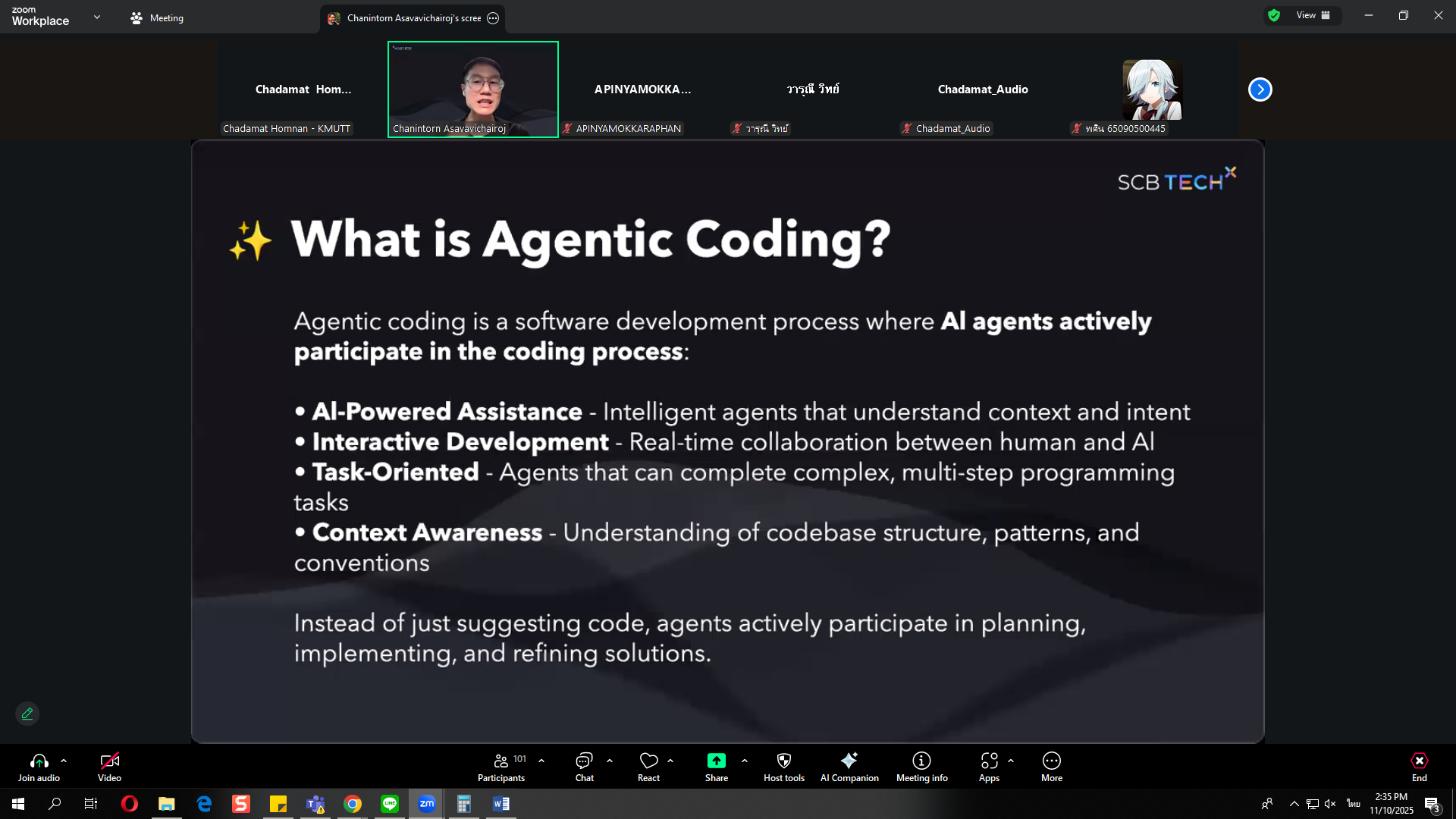 ในการบรรยายครั้งนี้ วิทยากรได้แนะนำภาพรวมของ SCB TechX ซึ่งเป็นองค์กรเทคโนโลยีชั้นนำในเครือธนาคารไทยพาณิชย์ พร้อมให้ความรู้ด้าน Agentic Coding รวมถึงแนวทางการเขียน Prompt เพื่อสร้าง Code ที่สามารถใช้งานได้จริง